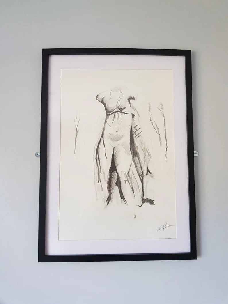 The drawing is a UK size A2 (59.4cm x 42cm) and is sold unframed. Please note, the frame in the photograph is for picture purposes only.