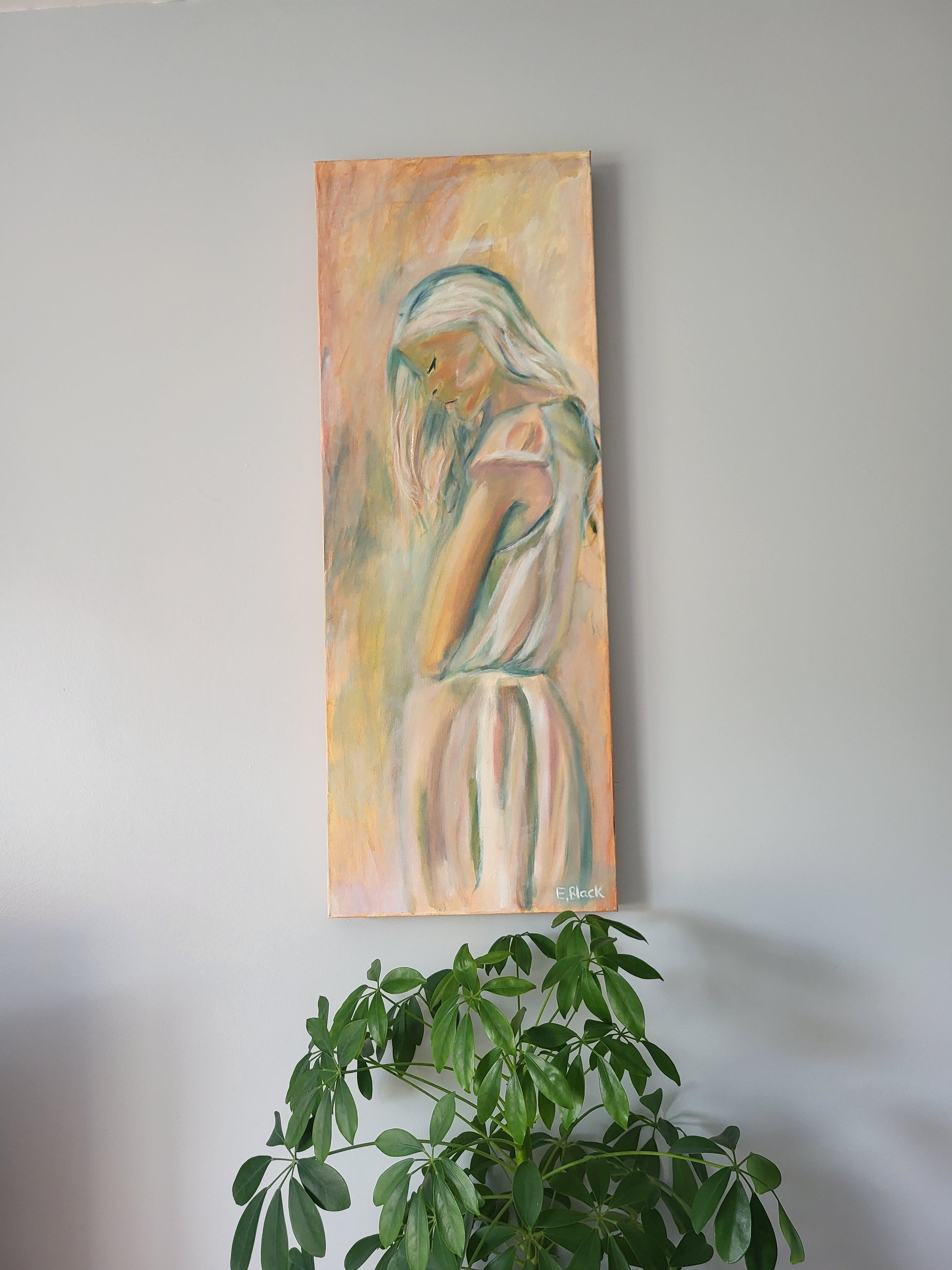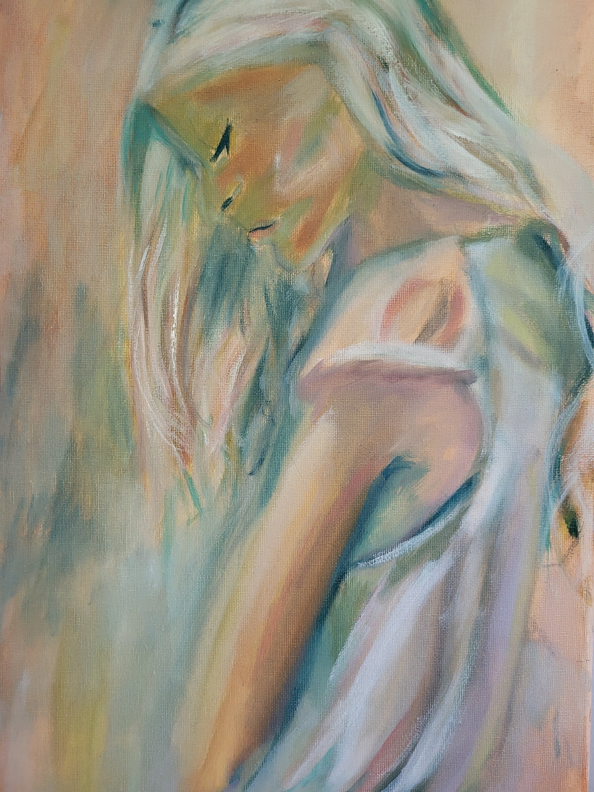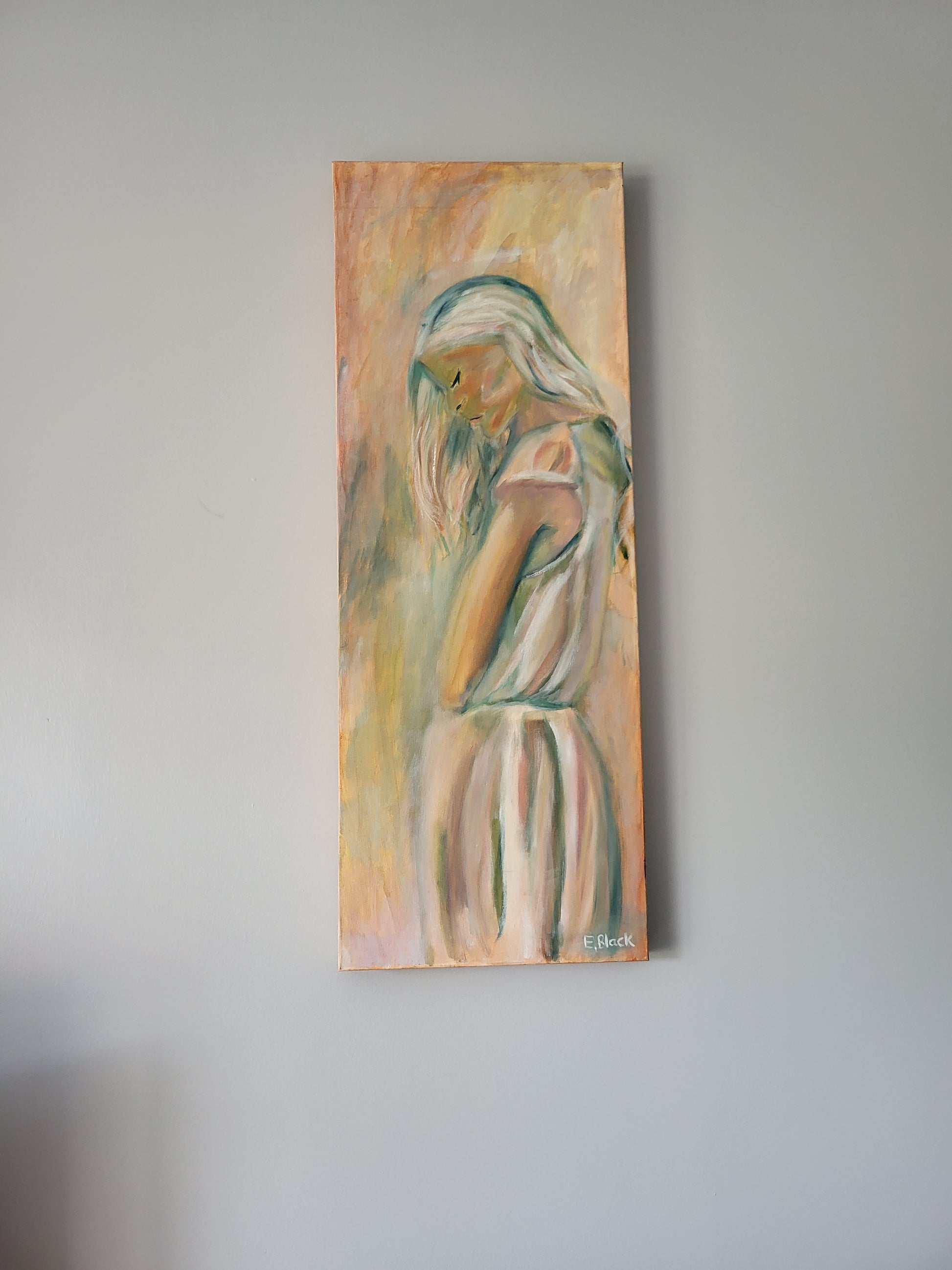 The gentle brushstrokes and harmonious blend of peach, cream, and muted blue tones create a sense of serenity and introspection, making this figurative piece a timeless statement for modern or contemporary interiors.