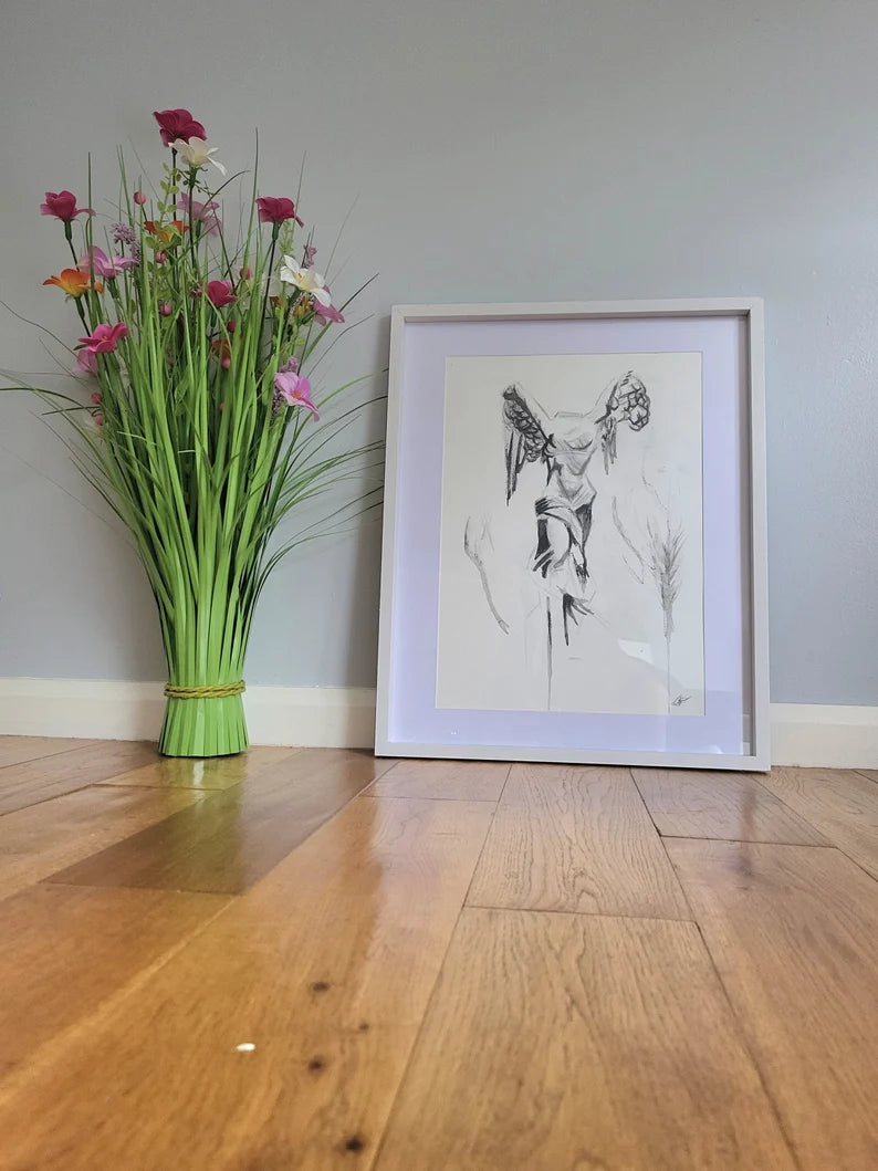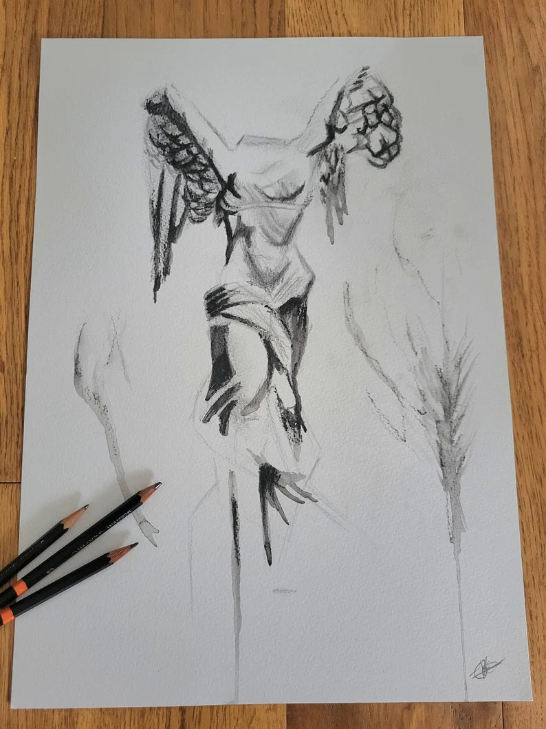 Presenting my original mixed media drawing 'Winged Victory Goddess' on Bockingford watercolour paper. The drawing was created using graphite pencil, charcoal and water soluble graphite. This is an original hand drawn piece of artwork and therefore only one is available. As this is an original drawing, there may be some slight smudge marks which naturally occurs during the drawing process.