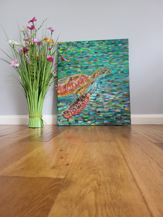 Green Ocean Swimming Turtle - Original Oil Painting on a 50cm x 60cm Canvas